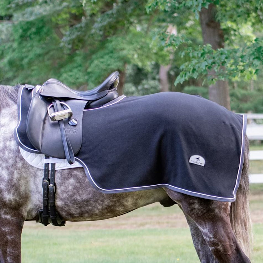Next, I like to look for ways to keep him happy and comfortable in the colder weather. Goose has a Weatherbeeta dog blanket and some protective pup boots from past orders with SmartEquine. They keep him feeling warm and protected from the wind, and his paws stay safe against the ice and salty roads on our walks. Goose also loves snuggling into my horse Nemo’s SmartPak Classic Fleece Quarter Sheet, after Nemo has warmed up. I’ll pull the quarter sheet off Nemo, and place it in the corner of the ring, and Goose will head over and curl right up into it.