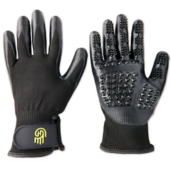 Next, I break out the HandsOn® Gloves for Grooming. These are super easy to use, plus durable and effective tool! They're made to be flexible, wearable, and really let you get in the tricky areas like legs and bellies. The rubber scrubbing nodules are perfect for breaking up mud stuck in Truffles' coat and even help me finger-comb through her mane and tail! I love that these gloves are a multiuse tool for tackling mud in all places on the horse.