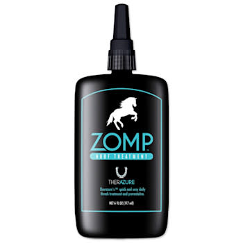 Once Truffles has nice, clean, mud free hooves I apply a product to keep thrush at bay. Over my years of owning horses, I’ve tried a variety of thrush treatments, some that have worked great and others that were not so great. Lately, my favorite has been Therazure’s Zomp! This is a newer product for us, and I have been using it consistently since we started to carry it. Zomp is a very simple formula of copper sulfate, sodium bicarbonate (baking soda), and distilled vinegar.