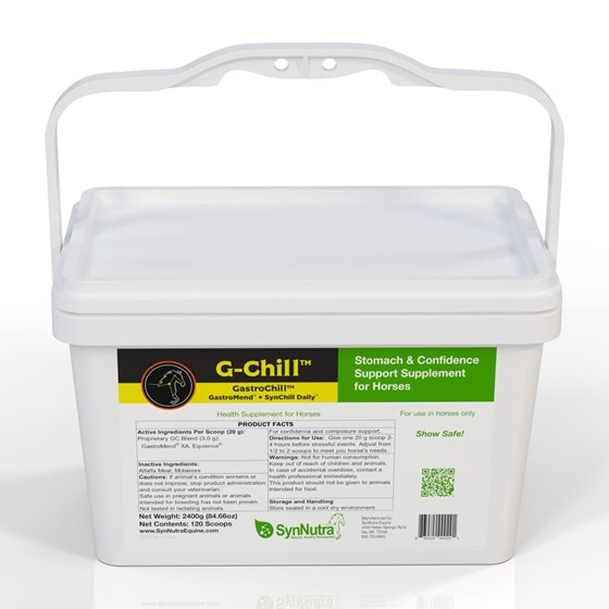 G-Chill™ Equine Supplement unites the complementary nutritional approaches of GastroMend and SynChill into one convenient daily supplement. Veterinarian formulated to help maintain a healthy stomach and hindgut environment & support overall gastric health. G-Chill™ also provides key nutrients to support everyday composure and focus without dulling performance - allowing your horse to be present to the task at hand.