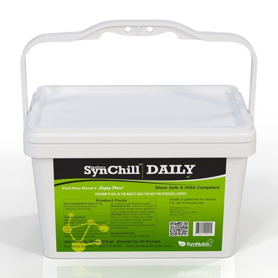 SynChill Daily™ pellets are a calming supplement for horses that will help support a calm and focused demeanor during periods of increased stress. This veterinarian-developed formula is designed to support attentiveness, adaptability, and confidence while keeping your horse alert and responsive. Together, these carefully selected ingredients help maintain composure without compromising performance.