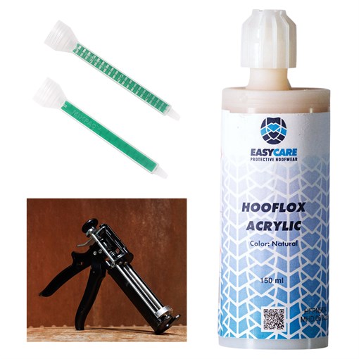 The EasyCare HoofLox Acrylic Glue Starter Kit contains everything you need to get started with your glue on shoes. This kit comes with a 150 ml bottle of EasyShoe HoofLox Acrylic Adhesive, 10 mixing tips, and an applicator gun.