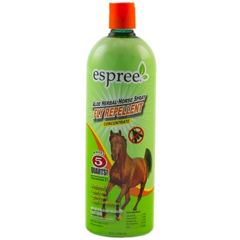 "Espree® Aloe Herbal Fly Repellent 5:1 Concentrate is formulated using a gentle blend of ingredients, including botanical oils, to repel flies, gnats and other flying insects on horses. The fly repellent also contains coat conditioners to promote a healthy coat ...
