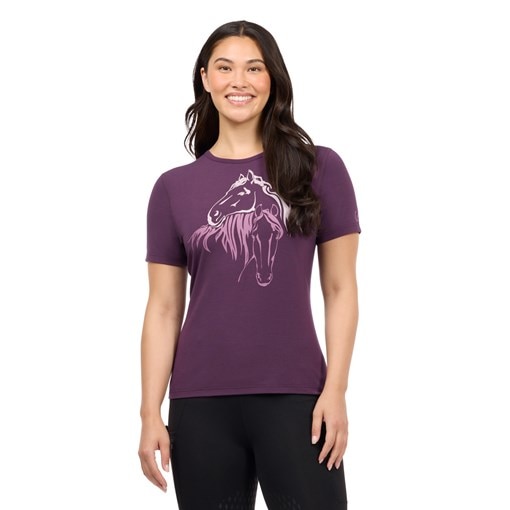 Two equine best friends share a quiet “embrace” on this soft, technical short sleeve tee that keeps you cool and comfortable all day long. Breathable and moisture-wicking, it’s built to handle warm-weather rides and everyday adventures with ease. The stretchy, feminine fit and hip-length cut offer just the right amount of coverage for a confident, carefree feel, whether you’re in the saddle or on the go.