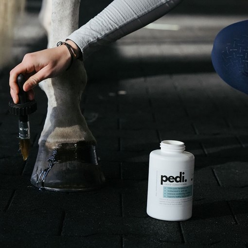 Pedi is a breathable hoof conditioner formulated to support moisture balance, structural integrity, and overall hoof health. Designed for routine care, it helps nourish dry, stressed hooves without sealing or suffocating the hoof wall. The formula features carrot seed and tea tree oils, selected for their cleansing and conditioning properties, to help maintain a healthy hoof environment. Unlike heavy petroleum-based coatings, Pedi absorbs cleanly while allowing the hoof to maintain natural airflow—an essential component of long-term hoof resilience. With consistent use, Pedi supports hydration from the coronary band to the sole and frog, helping maintain strength and flexibility throughout the entire hoof structure. Ideal for horses exposed to fluctuating moisture, dry conditions, or demanding training schedules.