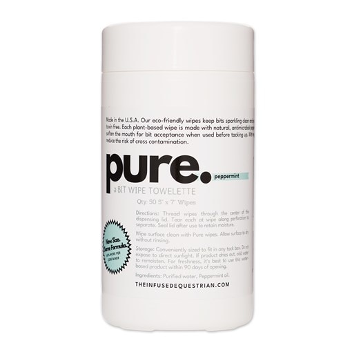 Pure is a performance-grade bit wipe designed unlike conventional cleaners that rely on synthetic solvents. Pure offers a clean alternative for routine tack hygiene - supporting a fresher bit and a more refined riding experience. The pre-moistened towelette allows for quick, convenient application; simply wipe the bit thoroughly and allow it to air dry before use to support clean, comfortable contact. Formulated with peppermint therapeutic essential oil, it effectively removes residue, saliva buildup, and debris without harsh chemical exposure.