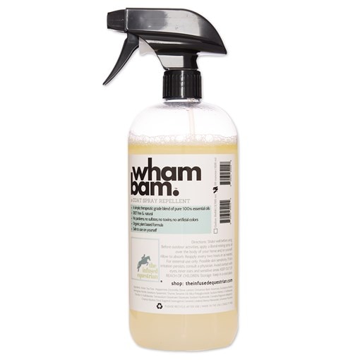 Wham Bam is a performance-driven coat spray repellent formulated to provide effective fly control without the heavy chemical exposure associated with conventional fly sprays. This formula utilizes a concentrated blend of plant-based active ingredients selected for their insect-repelling properties. The result is broad-spectrum defense against flies, gnats, mosquitos, no see um - all without harsh synthetic residues or overpowering fumes. Wham Bam sprays evenly, dries quickly, and leaves no sticky buildup on the coat. Suitable for daily use when applied as directed, it supports both skin comfort and coat integrity.